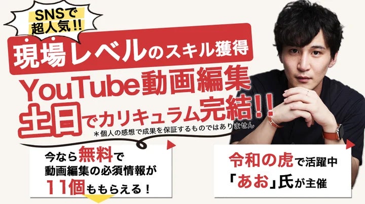 “動画編集CAMP”は、現在、令和の虎やYouTube動画編集業界で活躍中の「あお」氏が主催する動画編集におけるノウハウを2日間で学ぶことが出来るスクールです。